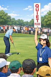 「プロゴルフの試合で、選手がアドレスに入ったとき、”Quiet Please”の縦長の札を掲げて、ギャラリーに静粛を促す大会スタッフのイラスト」