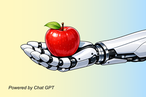 「人型ロボットが手の平にリンゴを乗せているイラストを描いて。ロボット全体ではなく、肘から先の部分だけでよい。フィジカルAIに関するブログ記事のアイキャッチ画像にするためのもの。フィジカルAIがリンゴを持った時に重さの感覚を感じるか、みたいな話題が出てくる記事。背景は特になくてよいが、ブログのアイキャッチなので、感じの良い仕上がりにしたい。 」