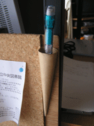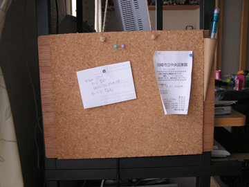 やっぱ右上のペン立て(写真下)でしょう。厚紙を円錐形に巻いてボードの右上に両面テープで接着。ペンを入れる入口は広いため出し入れが容易。また、購入したコルク板の幅が、板の幅(イコールパソコン台の奥行き)より微妙に狭かったため、ちょうどペン立てを設置する余裕があり、たいへんうまくいった。図書館の貸し出しレシートや、TODOメモなど、たいへん便利に使っている。