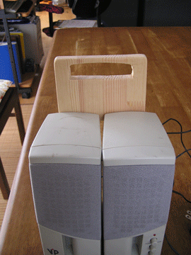 板に二本の円柱を垂直に接合。下穴をあけておいて木ねじで留め、完成。スピーカの裏に丸い穴が開いており、そこに入れるとちょうど持ち運べるようになる。