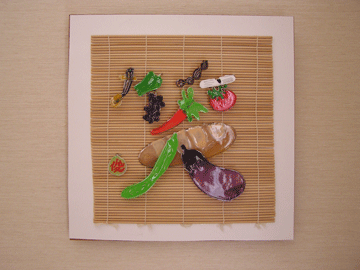 何と言っても、食べ物で文字を作るアイディアでしょう。うなぎやコーヒーは妻が好きなのも、中央のパンは作るのが得意。きゅうり、なす、トマトは作成シーズンの旬の夏野菜。巻きずし用のすだれ状の道具を使うアイディアは妻のもの。また、テーマに選んだ「笑」の文字は、トイレに飾ってあったカードに書いてあった次の言葉による。「しあわせの近道は、いつも笑顔でいること」から。最初は、次の作品「粘」に使った木枠の額に入れる予定だったが、入れる前に「額なしで、これでいいんじゃない?外が広がっていた方がいい気がする。」との妻のコメントから額なしで、次の作品を生むことに。