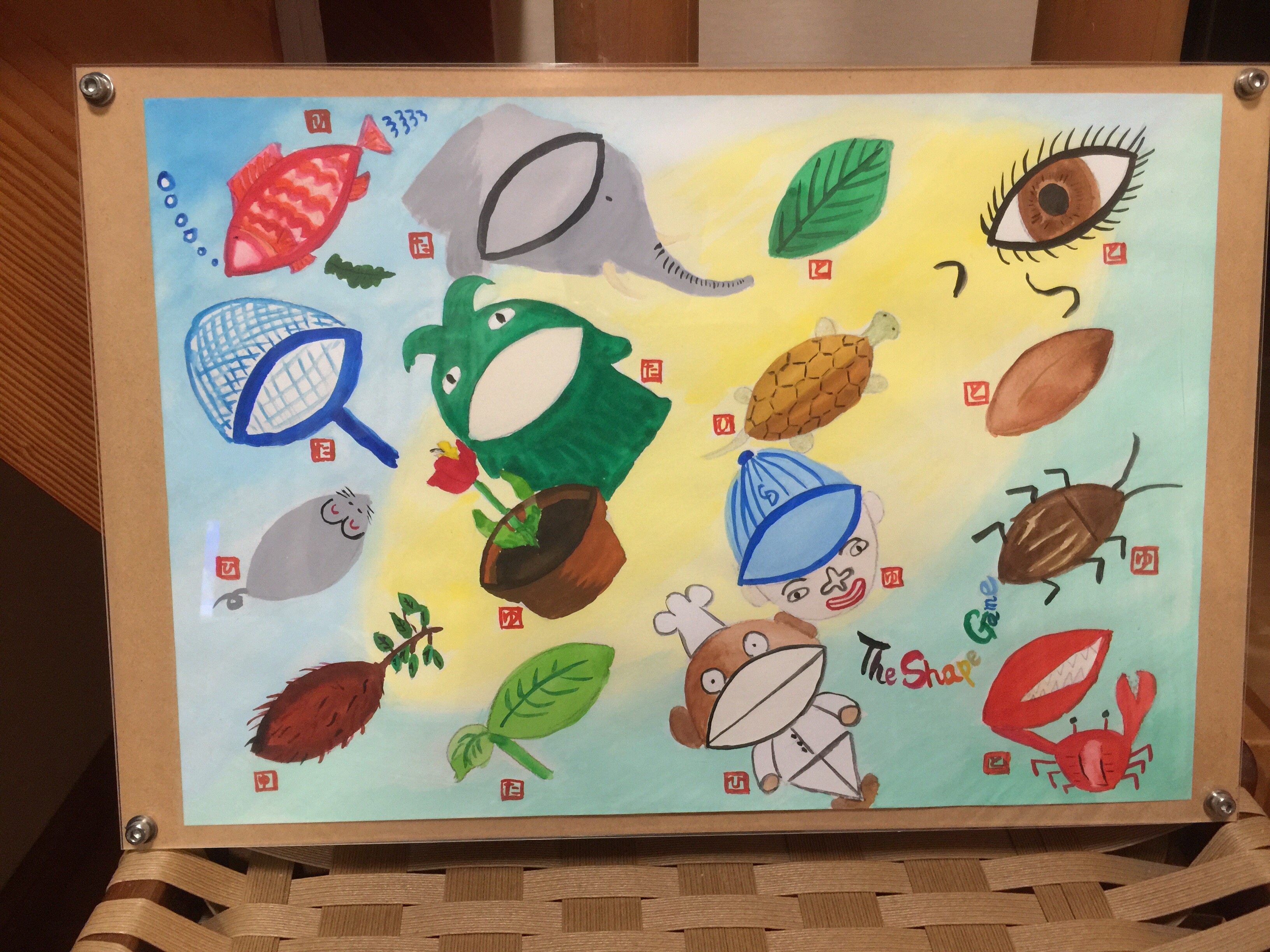 前回と同様だが、バックにも「葉」の形を描いて、奥行き感を出した。 (後日談:2016.7)今はもう子供たちも大きくなってこんな絵の遊びはしなくなったが、大人になっても面白いと思う。いつかまた第3弾を作成してみたい。