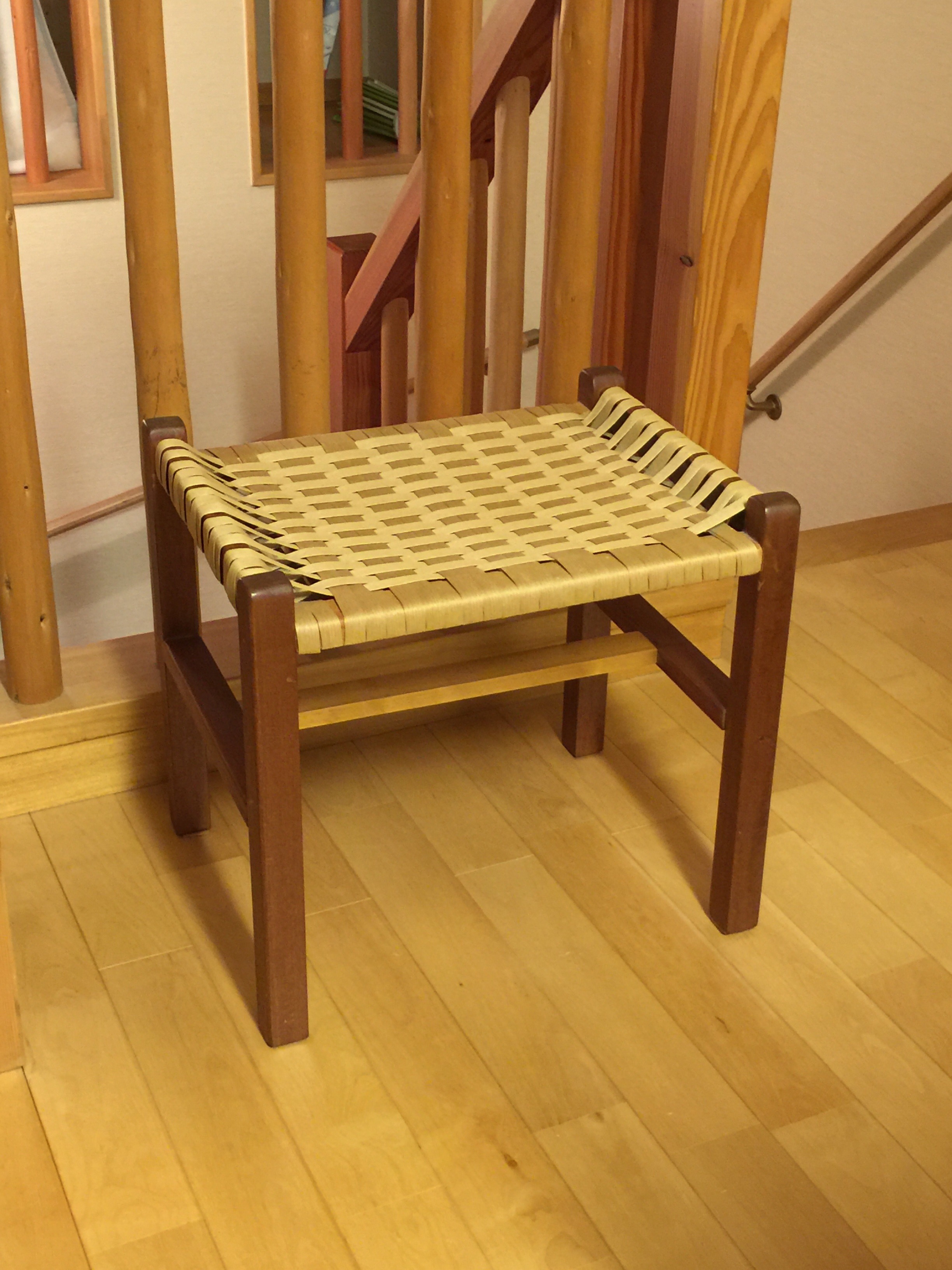 - 座面を平たいペーパーコードで編んだ点。細い繩状の紐ではなく、テープ状のものにしたため、楽に制作でき、強度も十分なものができた。座るとき、若干コード同士がこすれて軋る音がするが、ご愛敬、手作り感があってよい。